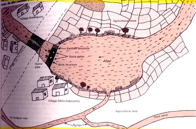 ‘Ahar’, ‘Pynes’, ‘Bunds’ or "Tanks" are indigenous systems of rainwater conservation, storage and distribution. They can be scientifically described as watershed management systems of excess rainfall. There are statistical and historical account of their evolution, as well as maintenance rules mentioned in Kautilya’s “Arthshashtra”, and descriptions of Francis Buchannan (1810–11), W.W. Hunter (1876) and various district Gazetteers of British Bengal Presidency. Pynes start from rivers, streams and even from upstream “ahar or bundhs”. Pynes also terminate in ahars/bundhs (reservoirs) irrigating the command in head and draining in the tail. Ahar–pyne systems are in series from upper to lower catchments of streams. Unlike medium and major irrigation systems of diversion weirs/ barrage/ dams and canals, these traditional system catch the run–off of the river, divert/store them in the ahar/ bundhs and irrigate in the immediate vicinity. Over and above, they also recharge ground water of the adjoining areas. Thus there is integrated watershed management of surface water of the streams by harvesting the rain water through pynes; storing the run–off in reservoirs of ahars / bandhs; indirectly recharging the ground water; irrigating the command in the vicinity of these structures; draining the surface run–off to lower ahars/bandhs; mitigating the flood peaks of streams by distributing flood discharge through pynes, apart from multiple other uses as pisciculture, aquaculture, meeting domestic and livestock drinking water needs.