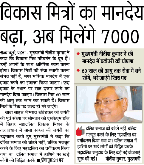 विकास मित्रों का मानदेय बढ़ा, अब मिलेंगें 7000 ।